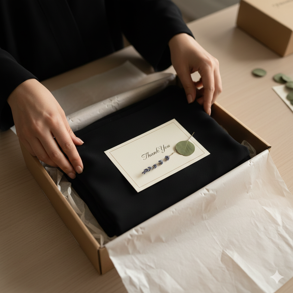 From the sewing table to your doorstep, quality control is our priority. Our team in Hyderabad carefully inspects each piece, hand-wrapping your abaya with care to ensure it arrives in pristine condition.